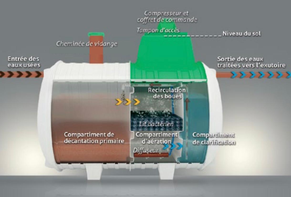 Les bactéries présentes dans la cuve dégradent la pollution avant que l’eau traitée ne soit infiltrée dans le sol ou rejetée selon la réglementation.